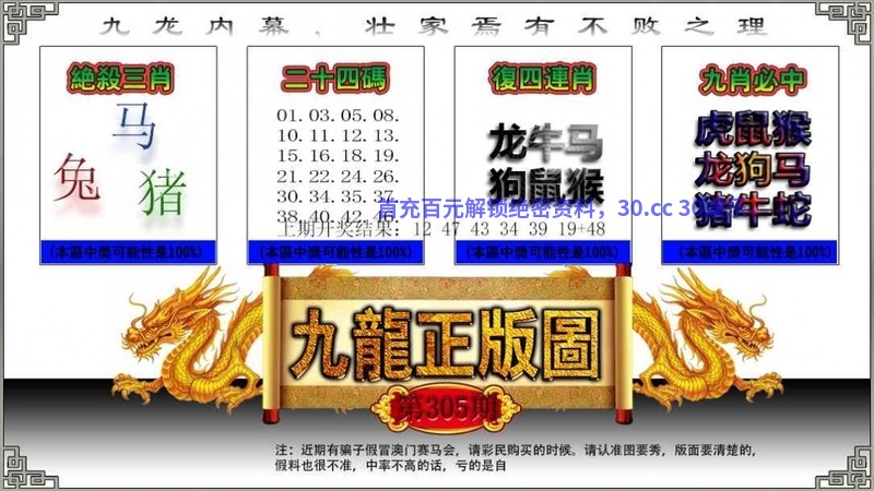 | 305期:九肖 | 马蛇羊鼠牛虎龙鸡猪 | 开:鼠42中 |